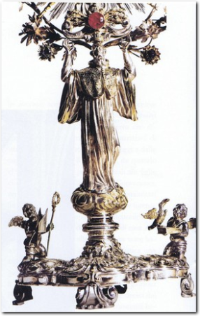 Pregiati per disegno ed esecuzione i settecenteschi ricami in oro e seta di alcuni paramenti della splendida veste della Vergine, certamente una delle più preziose tra quelle esaminate in Puglia.